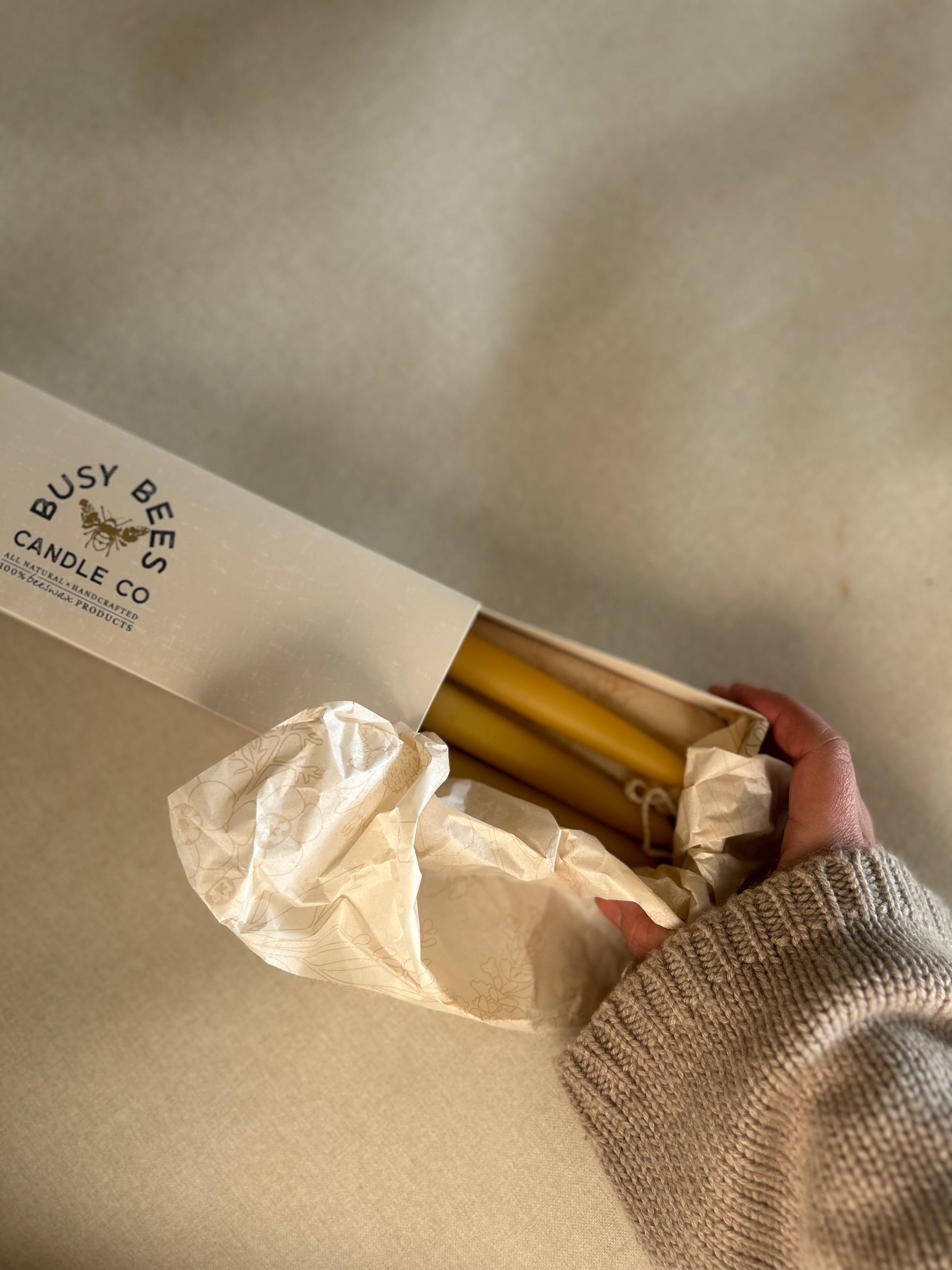 Let the soft flicker of our beeswax taper candles fill your home with warmth, light, and a touch of natural elegance. Whether it’s a family gathering, a holiday tradition, or just an ordinary evening made special, these tapers are a beautiful way to make every moment feel like home.